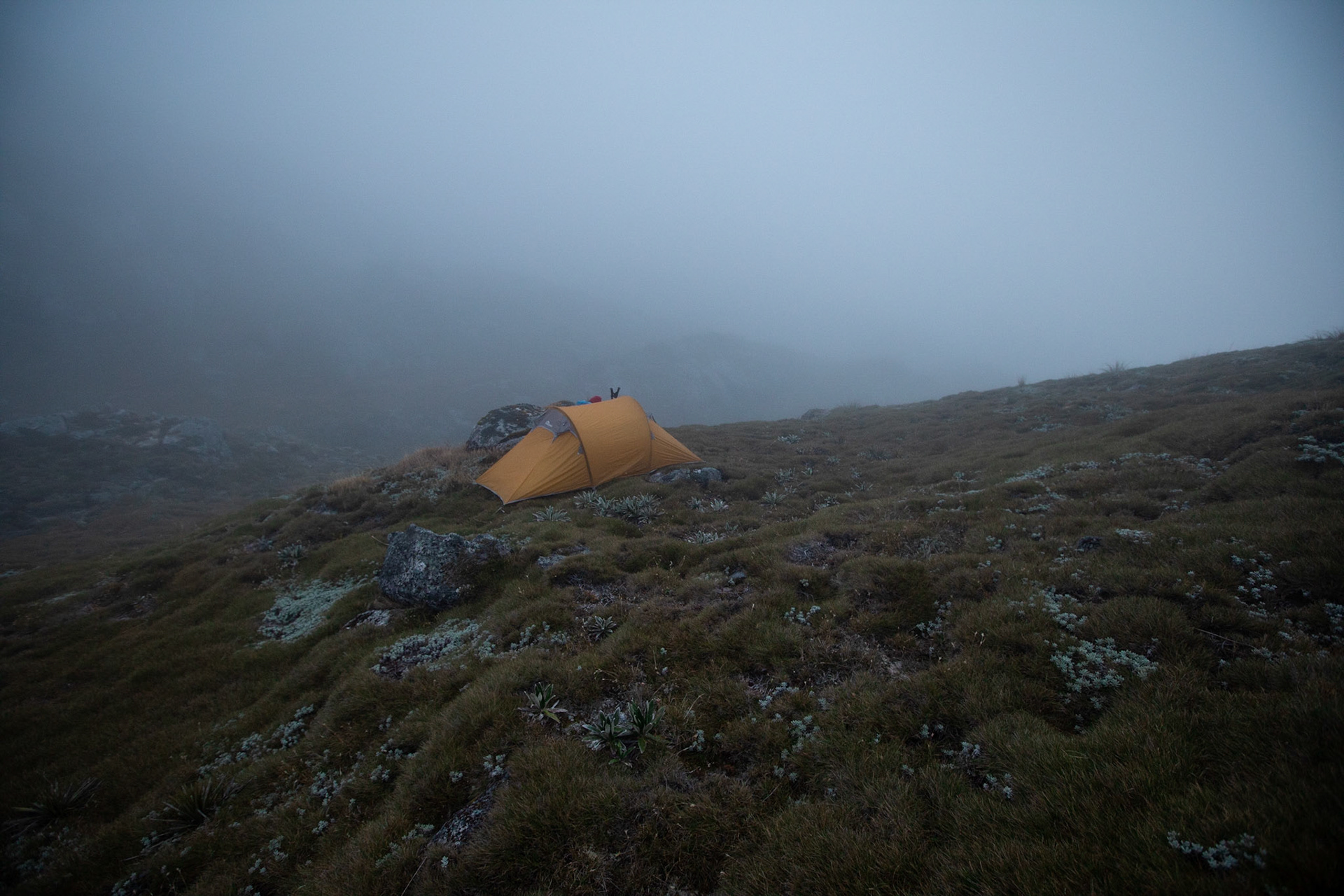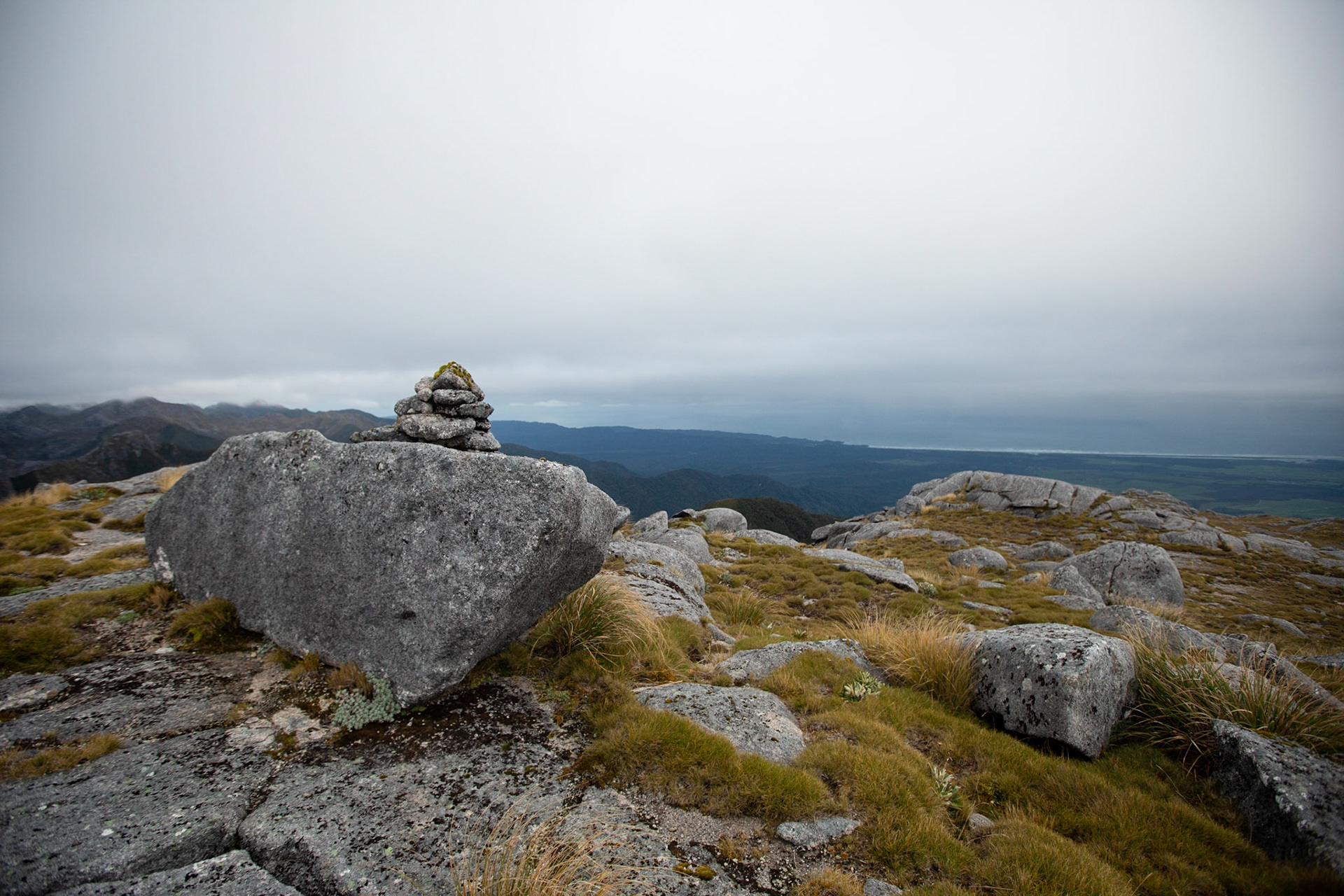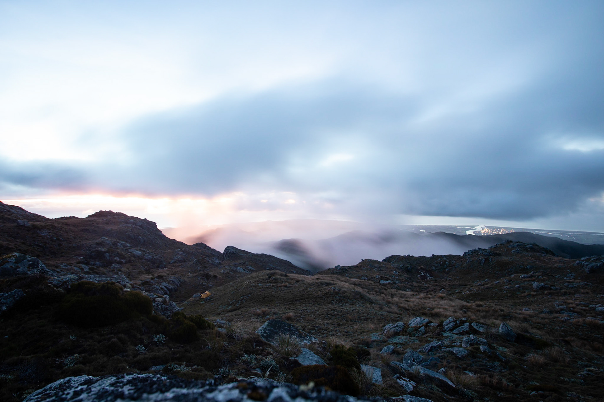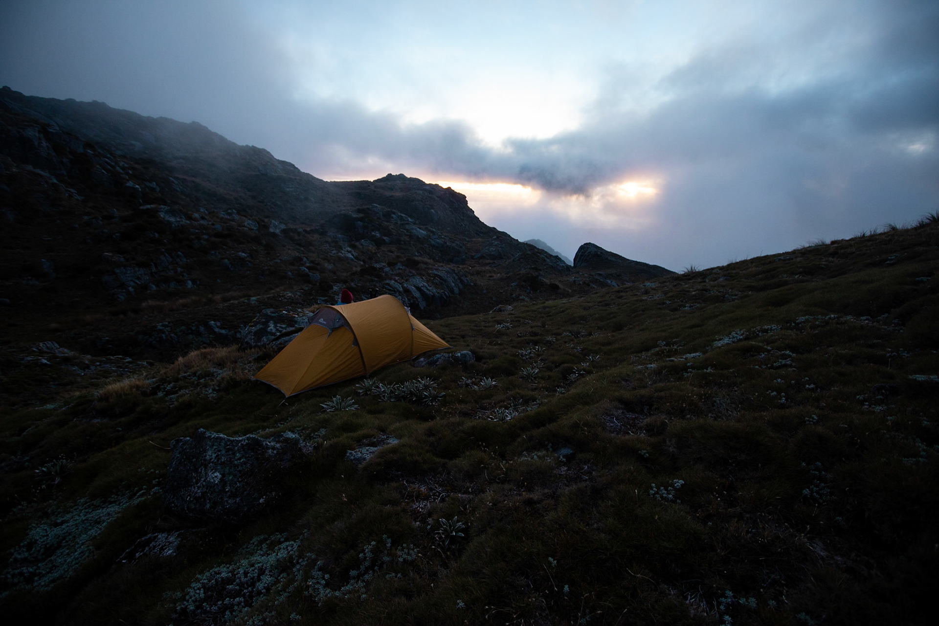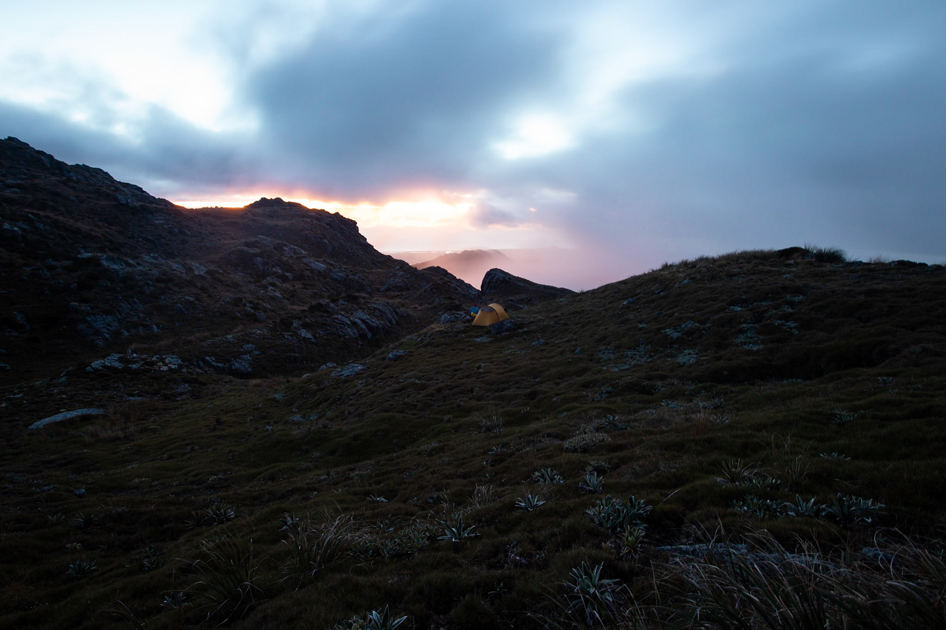 Camping on the tops above Buckland Peaks Hut in Late Autumn, looking along the precipitous Paparoa range which will have to wait for another trip in more stable weather.