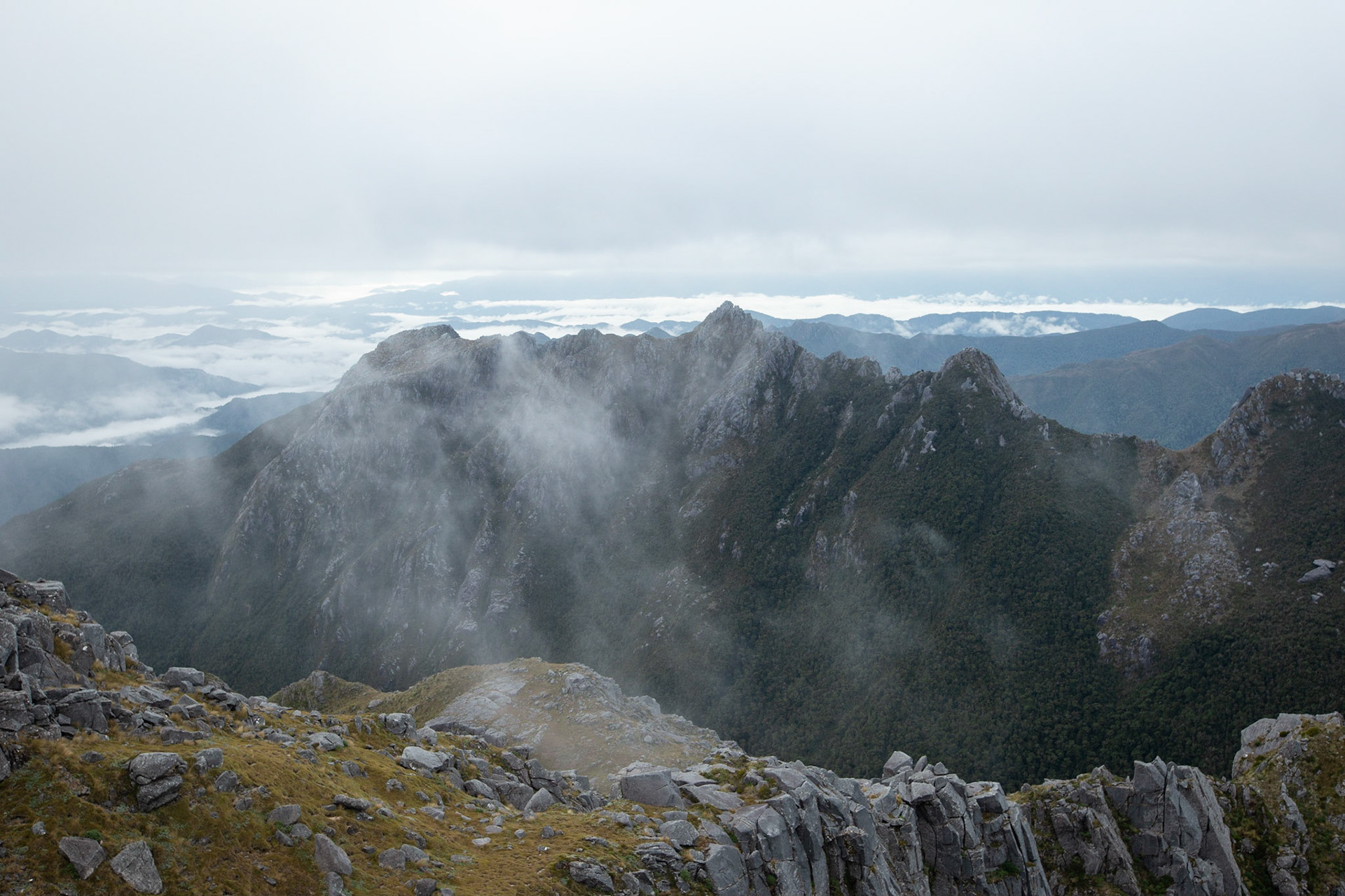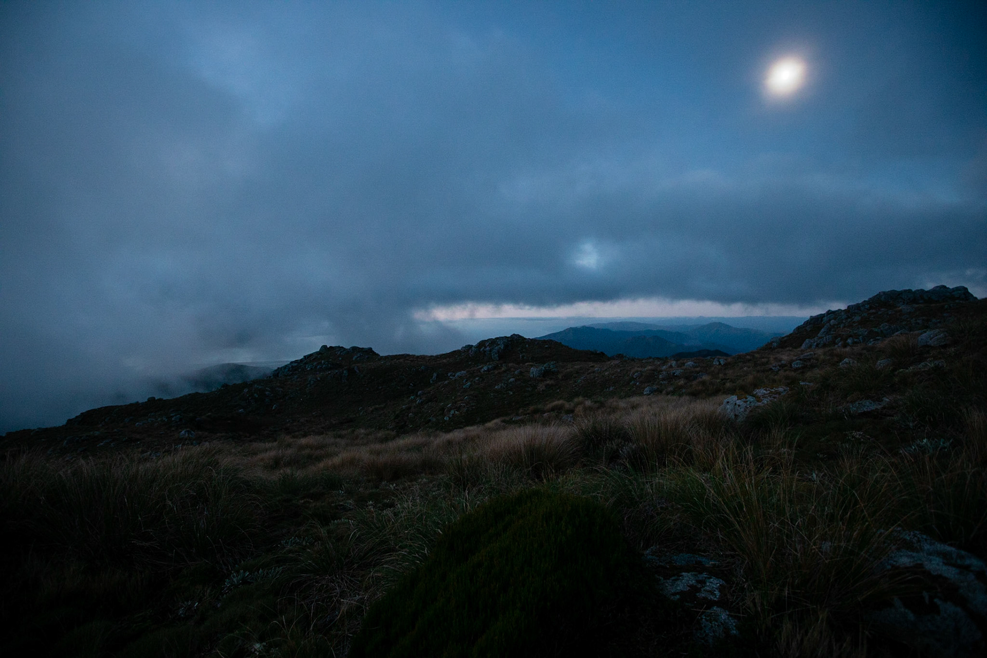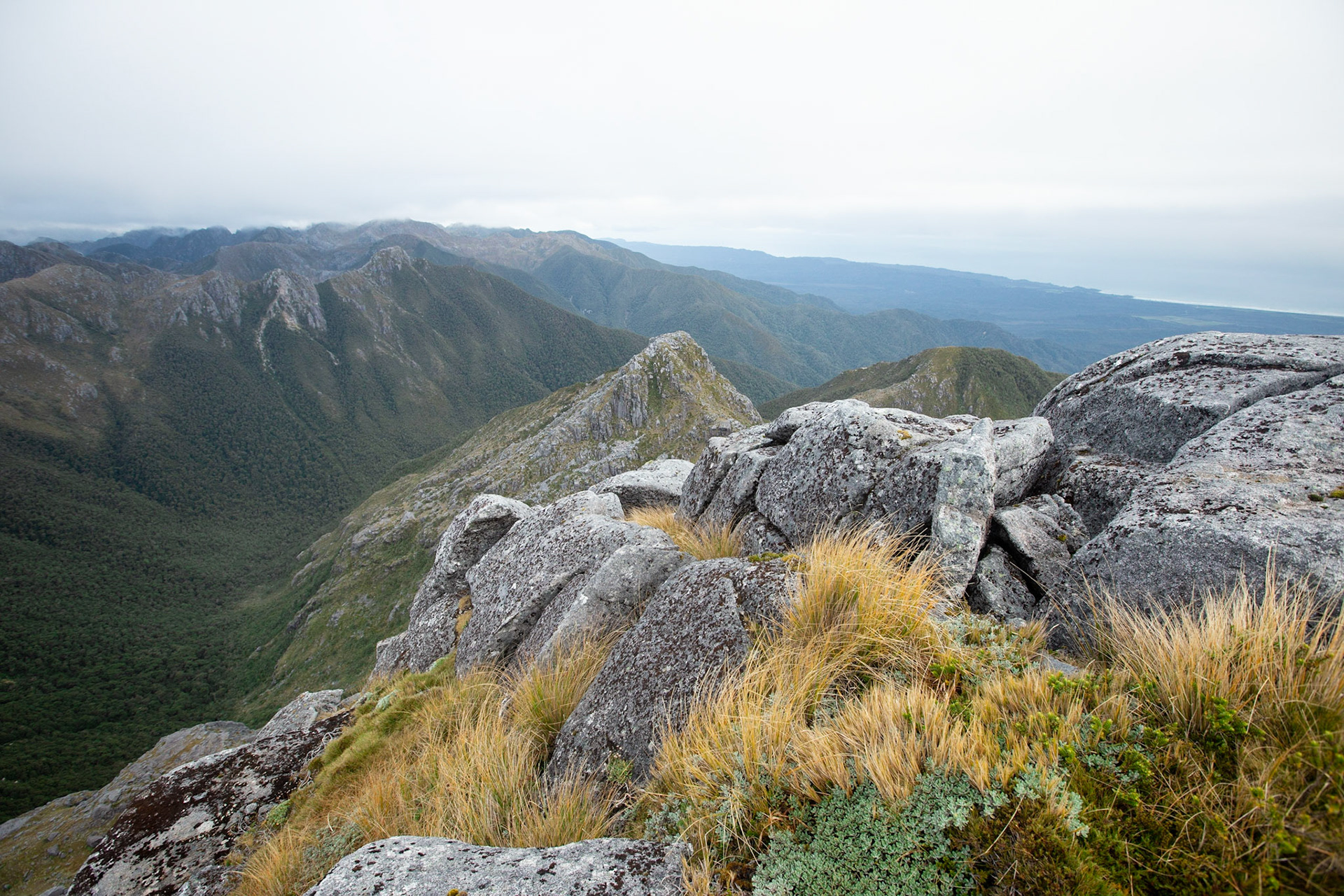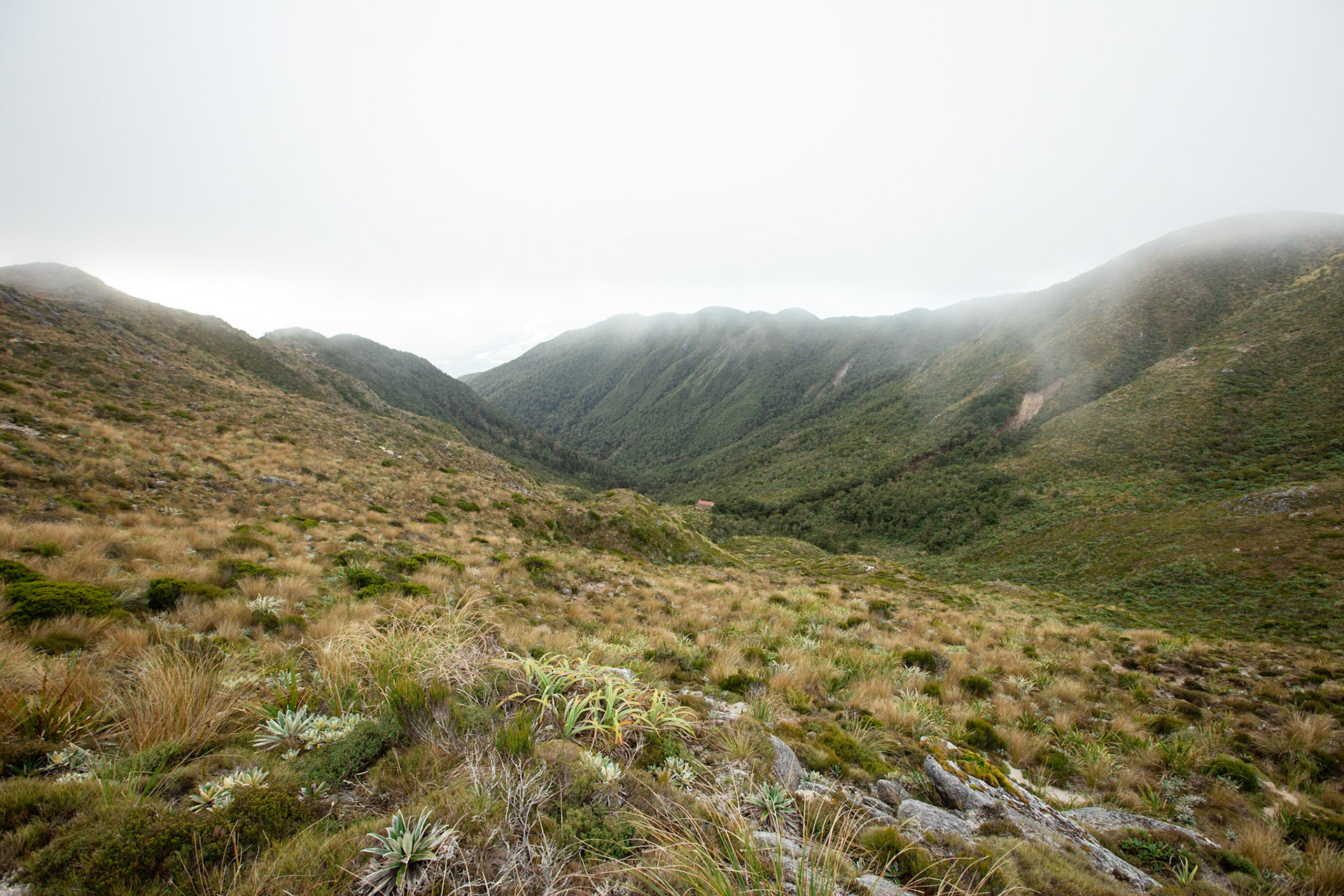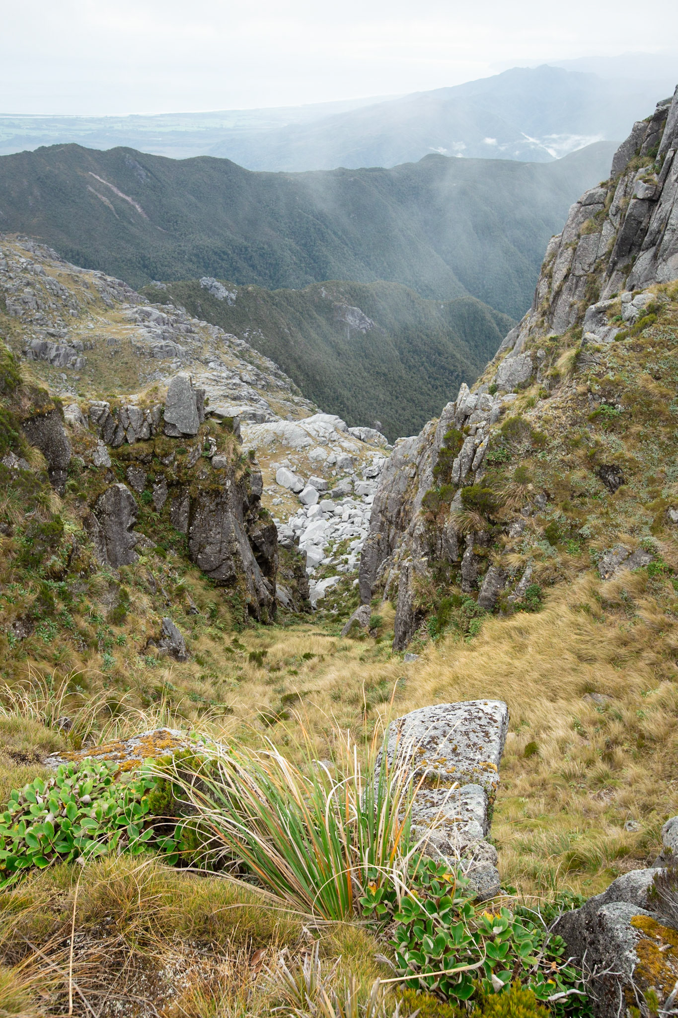 Camping on the tops above Buckland Peaks Hut in Late Autumn, looking along the precipitous Paparoa range which will have to wait for another trip in more stable weather.
