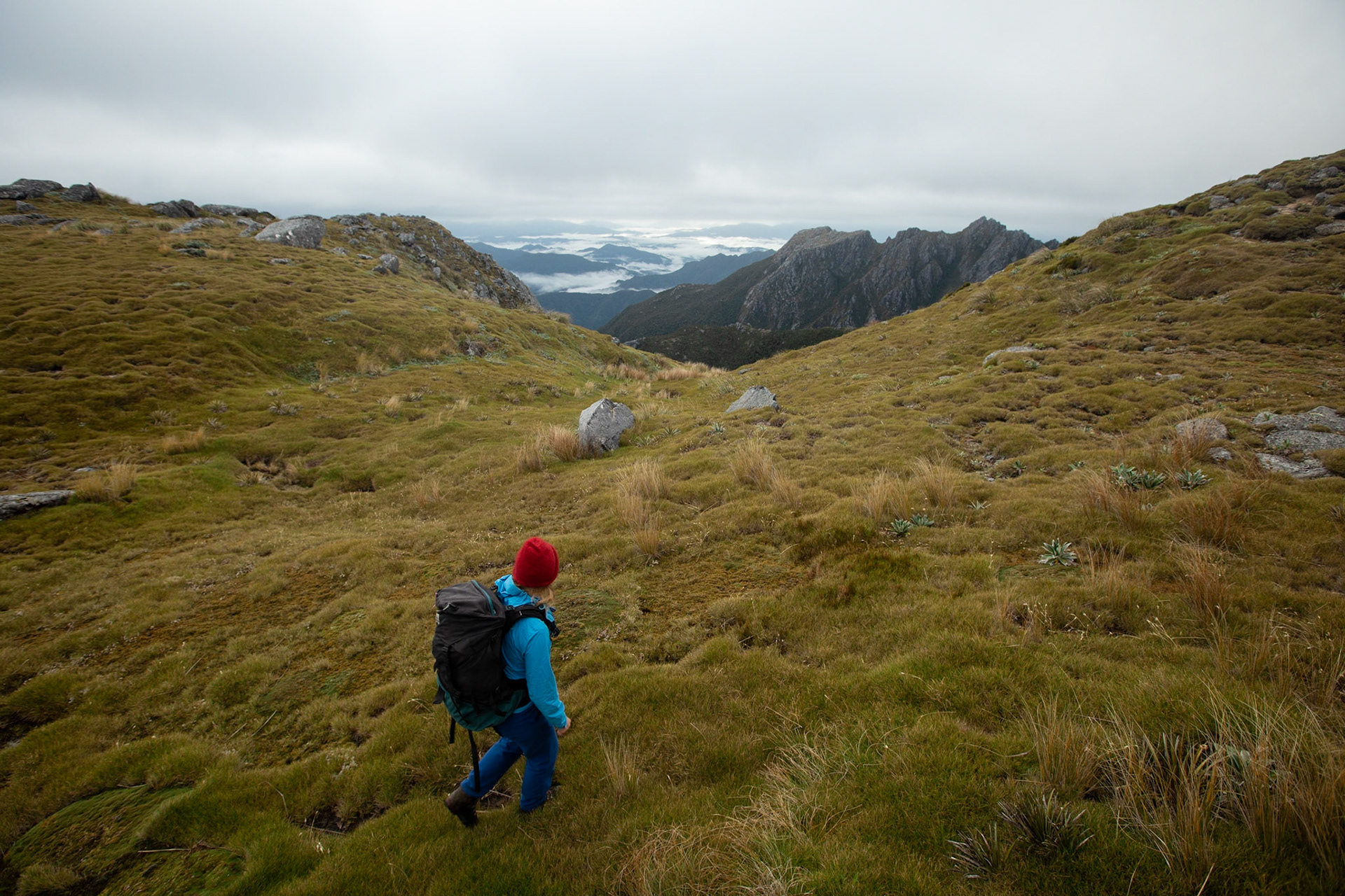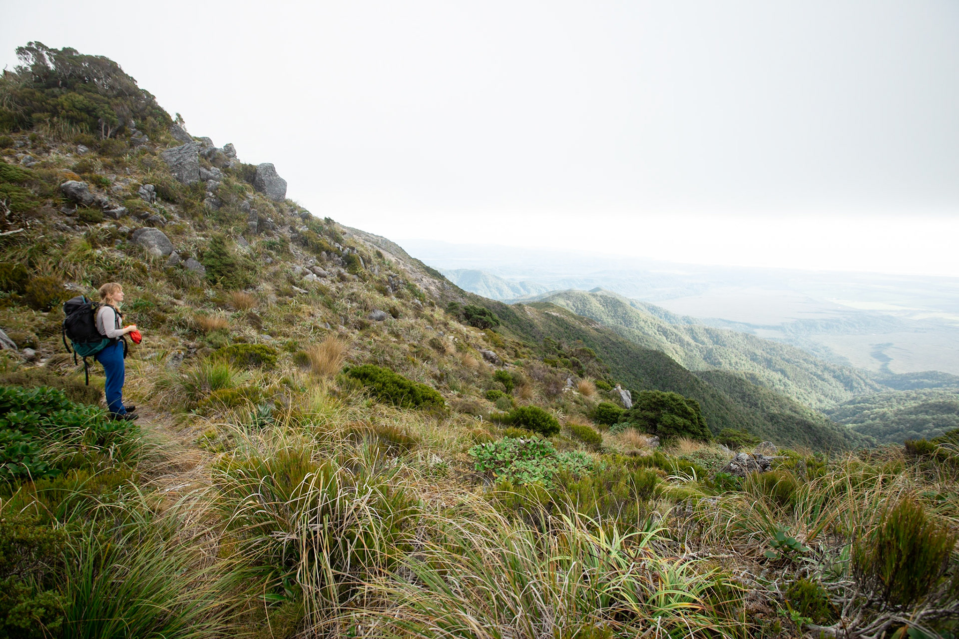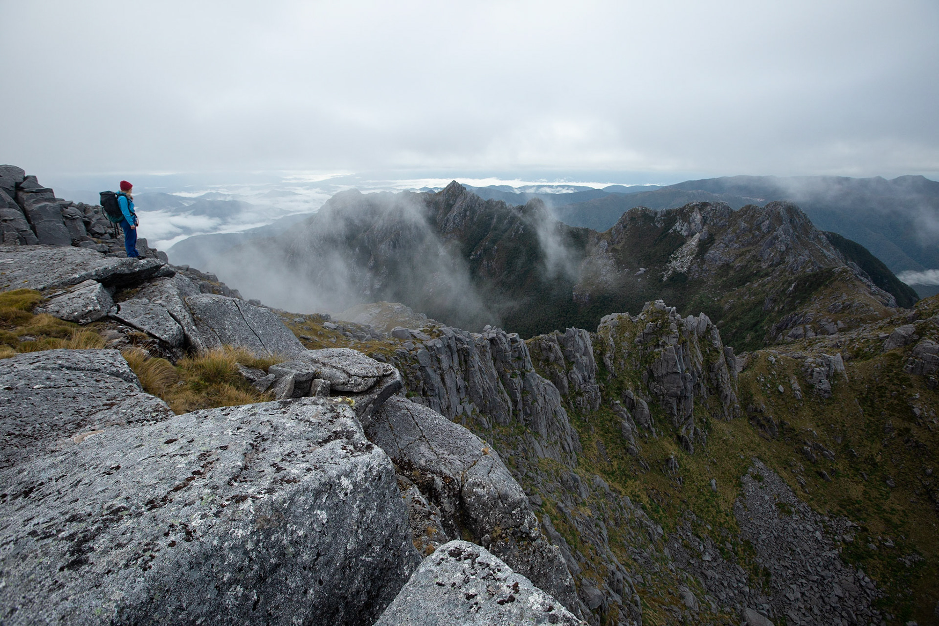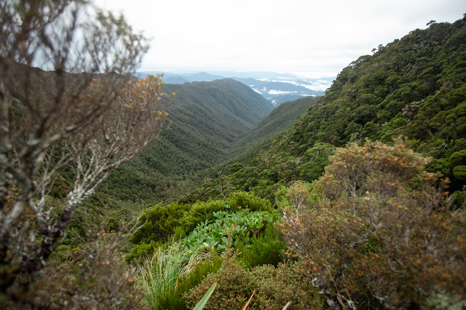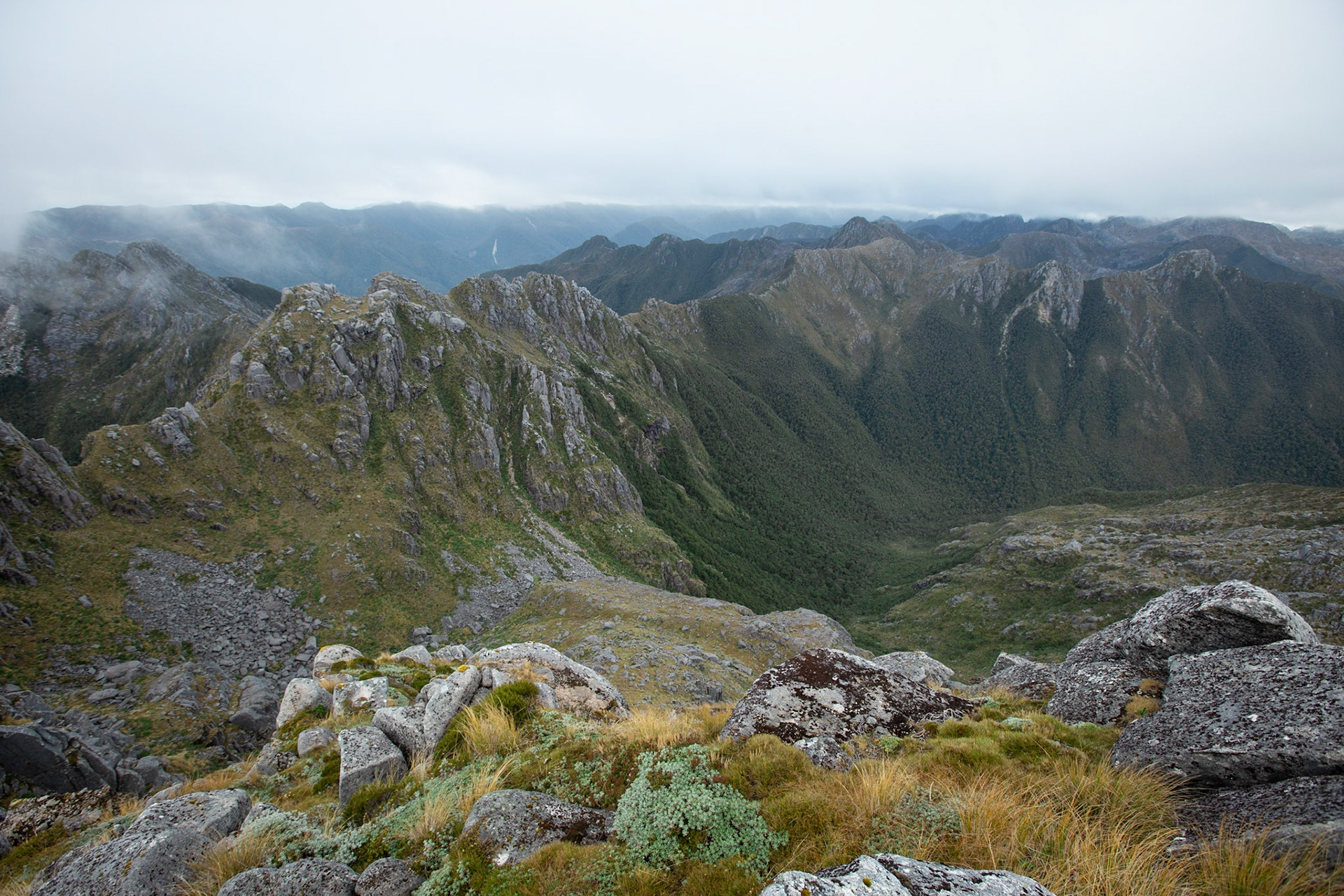 Camping on the tops above Buckland Peaks Hut in Late Autumn, looking along the precipitous Paparoa range which will have to wait for another trip in more stable weather.