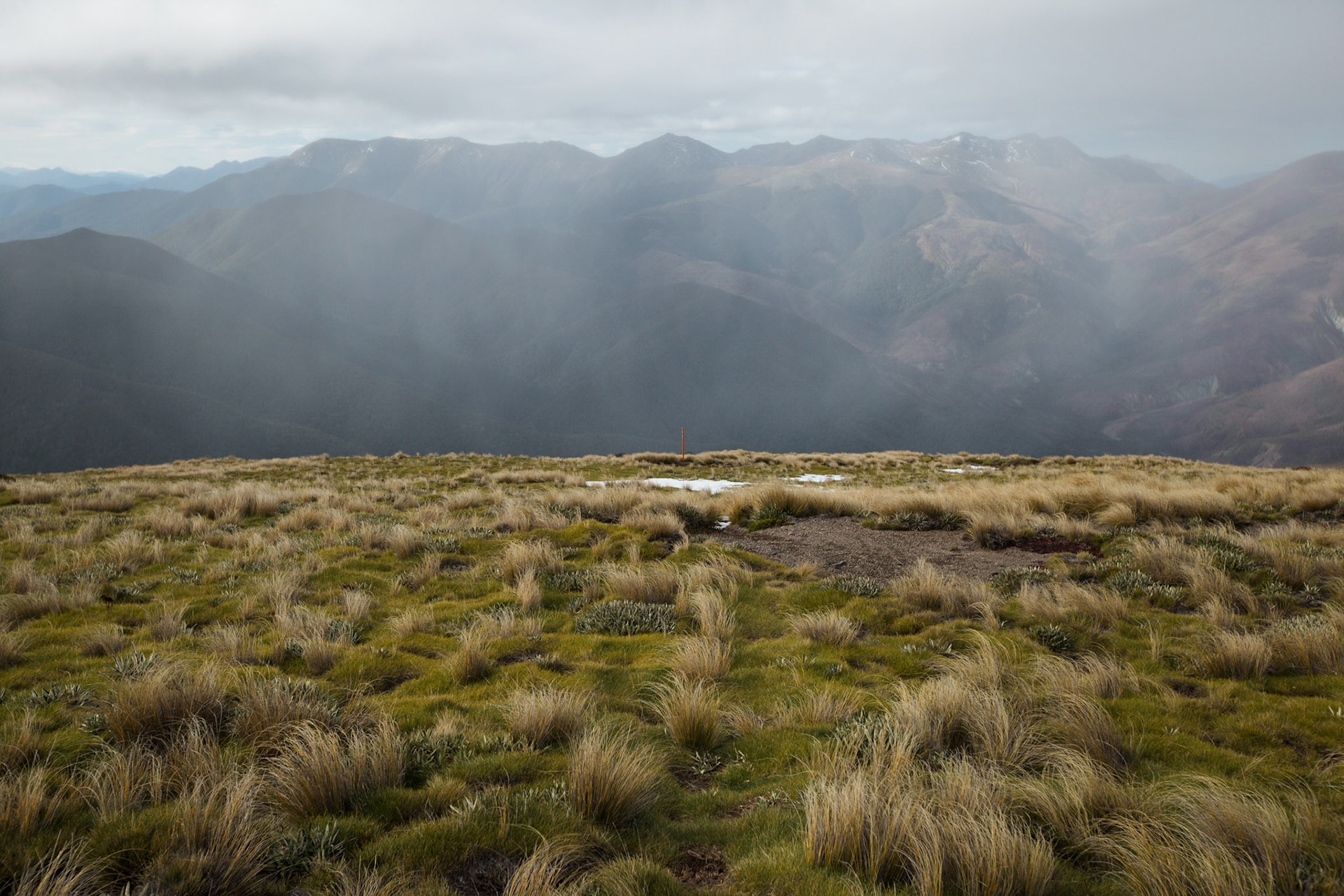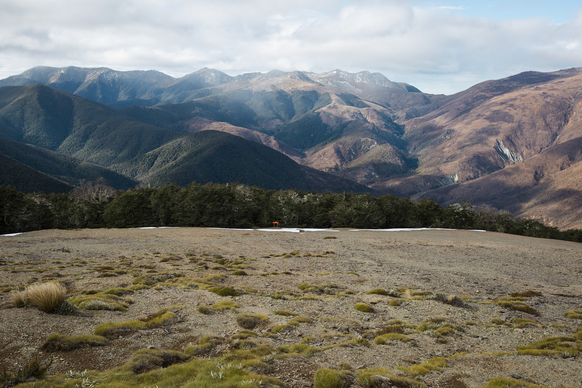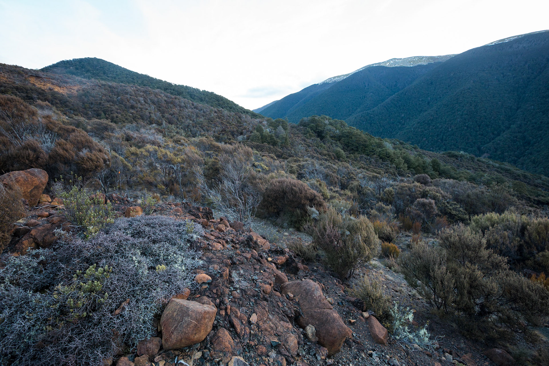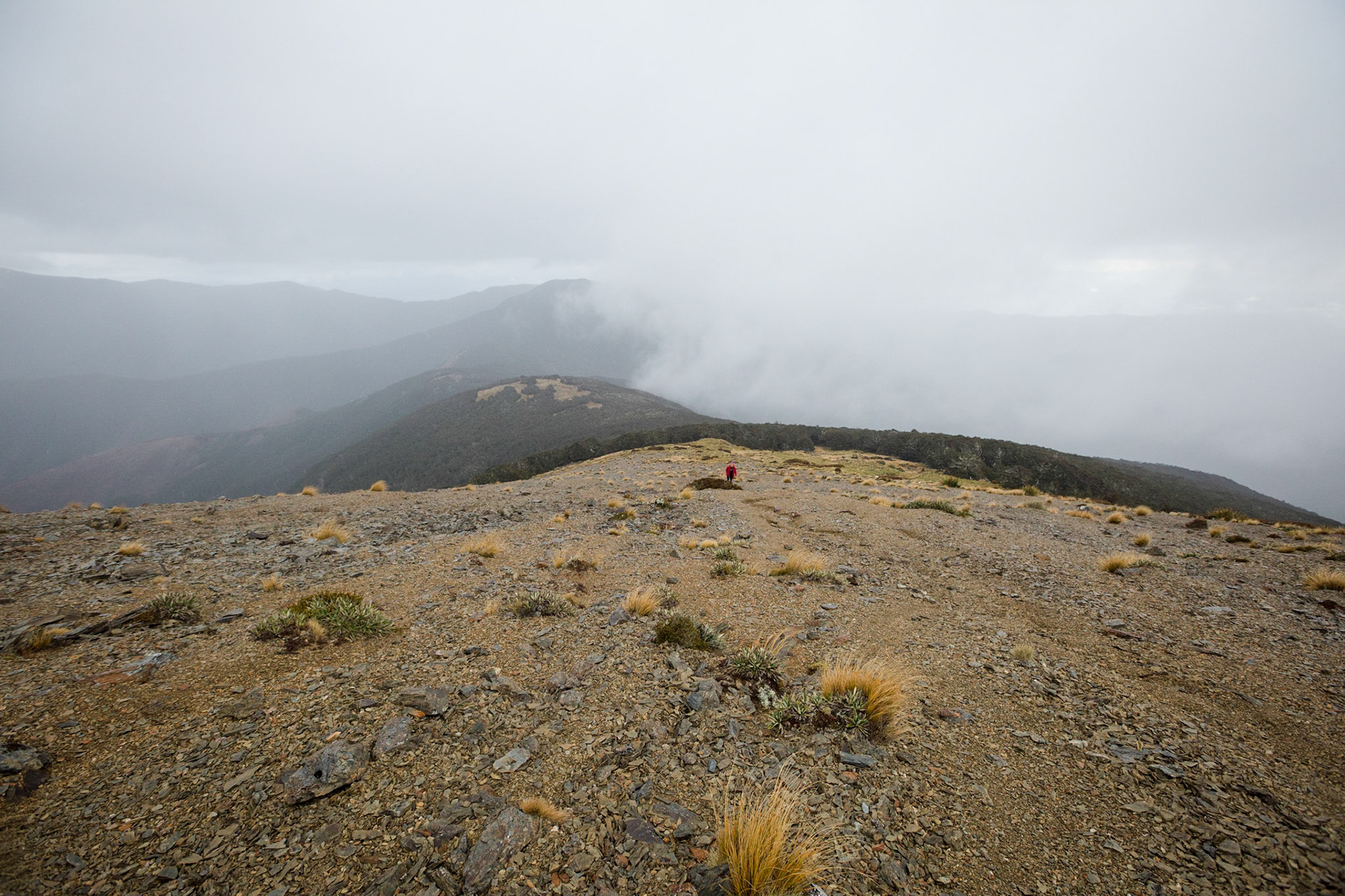A three day wander into the Red Hills of Mt. Richmond Forest Park. With murky weather forecast we settled on a sedate trip entering from Inwood's lookout and walking in to Hunters Hut on Friday. Walking up Mt. Ellis and back in misty drizzle on Saturday and then back out to Inwoods on Sunday morning. Hunter's Hut is a stunning little 8 bunker standard DOC hut with a good firebox and plenty of firewood nearby. An overnighter from Inwood's lookout would make a very pleasant weekend however the descent off the Gordon Range into the Motueka Left Branch valley is steep and often slippery, not great for young trampers. I must return in better weather to fully explore the Red Hills range proper.