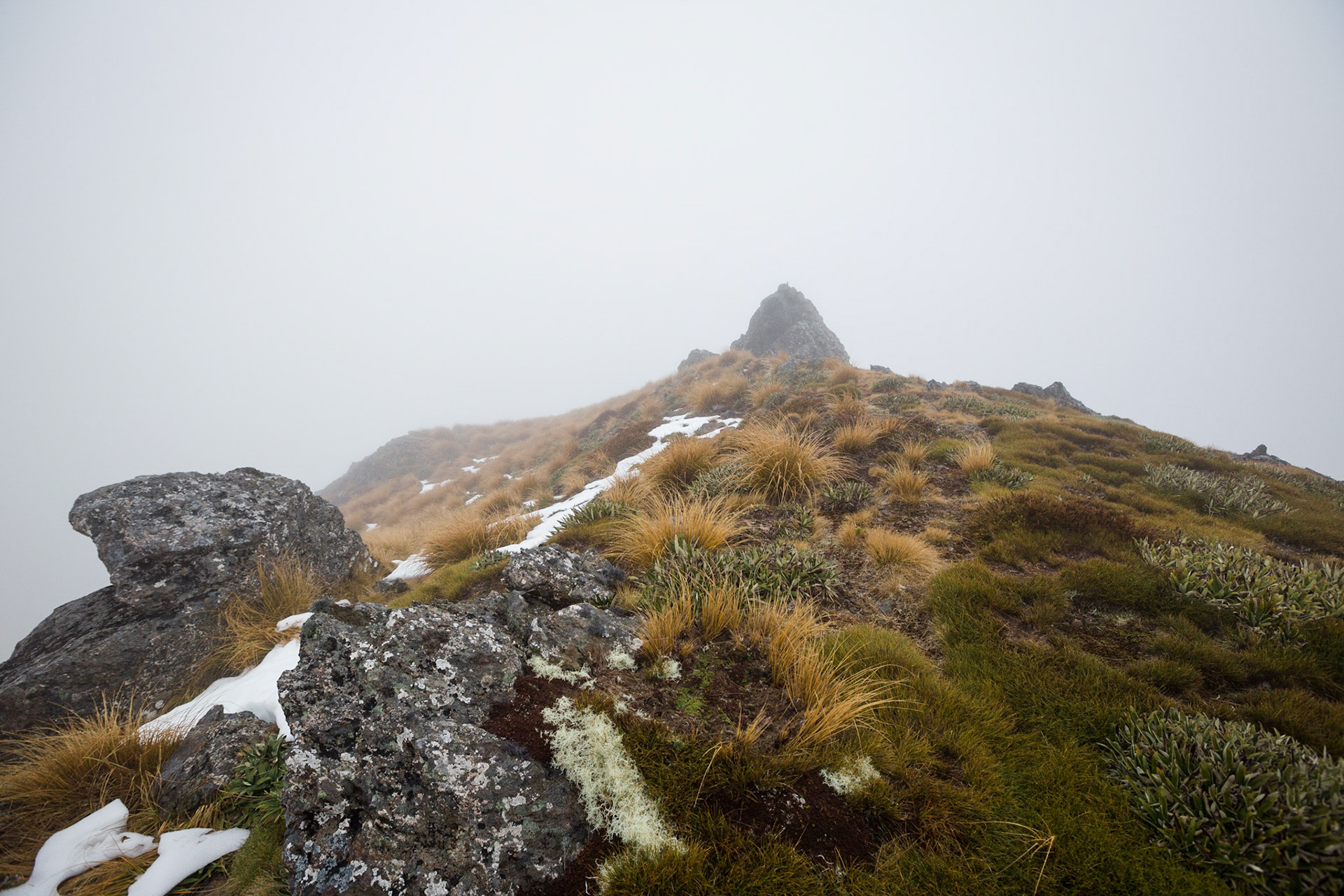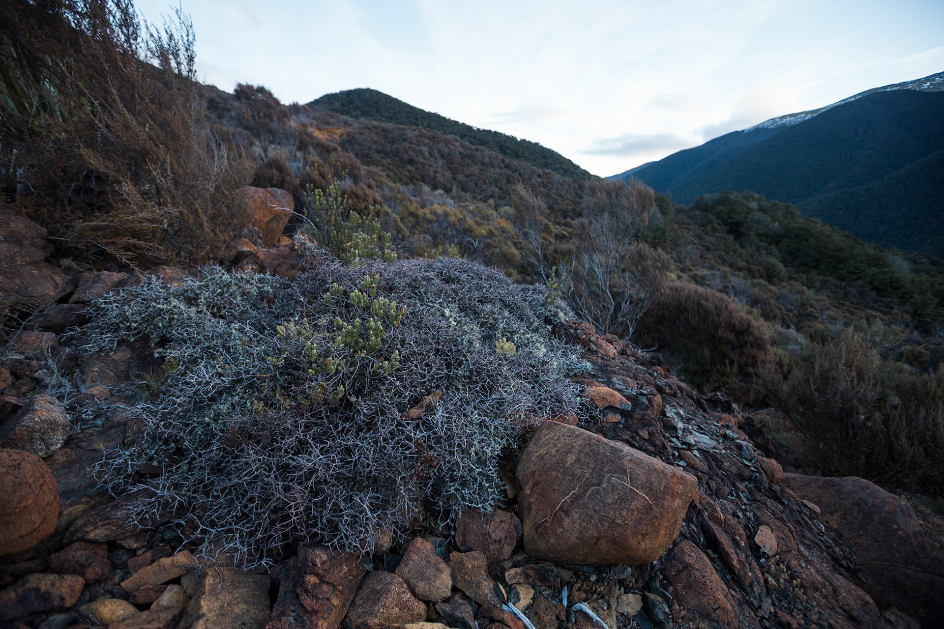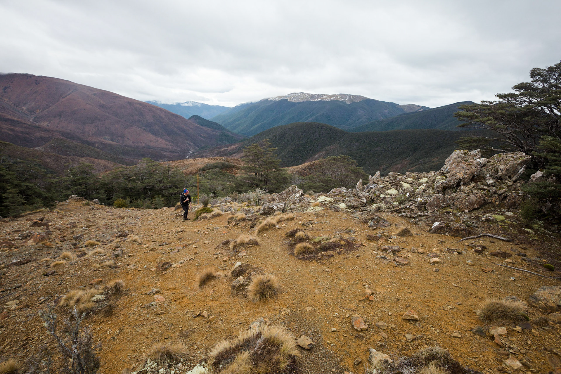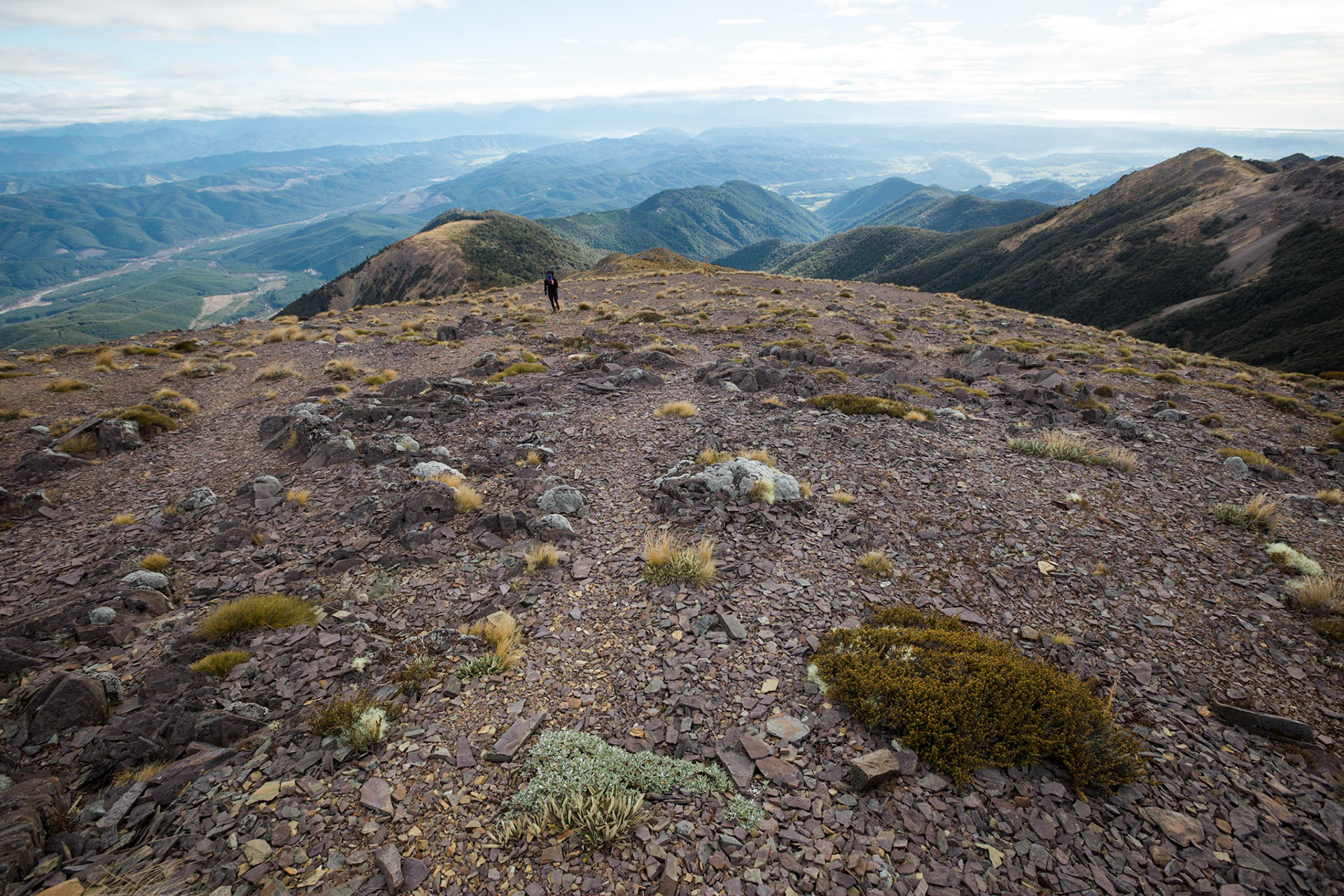 A three day wander into the Red Hills of Mt. Richmond Forest Park. With murky weather forecast we settled on a sedate trip entering from Inwood's lookout and walking in to Hunters Hut on Friday. Walking up Mt. Ellis and back in misty drizzle on Saturday and then back out to Inwoods on Sunday morning. Hunter's Hut is a stunning little 8 bunker standard DOC hut with a good firebox and plenty of firewood nearby. An overnighter from Inwood's lookout would make a very pleasant weekend however the descent off the Gordon Range into the Motueka Left Branch valley is steep and often slippery, not great for young trampers. I must return in better weather to fully explore the Red Hills range proper.